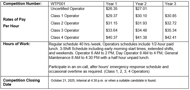 Ref # WTP2025 - Wastewater Treatment Plant Operator - Full Time - CUPE